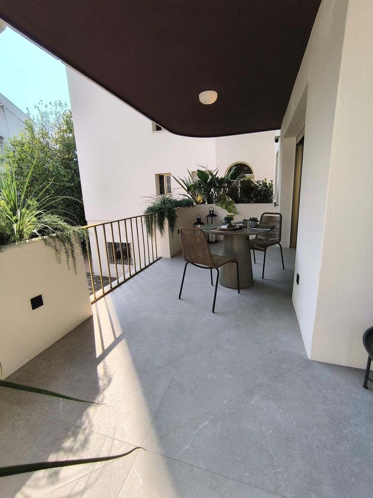 Terasa su netiesioginiu apšvietimu, automatine laistymo sistema ir apšvietimu vazonuose.