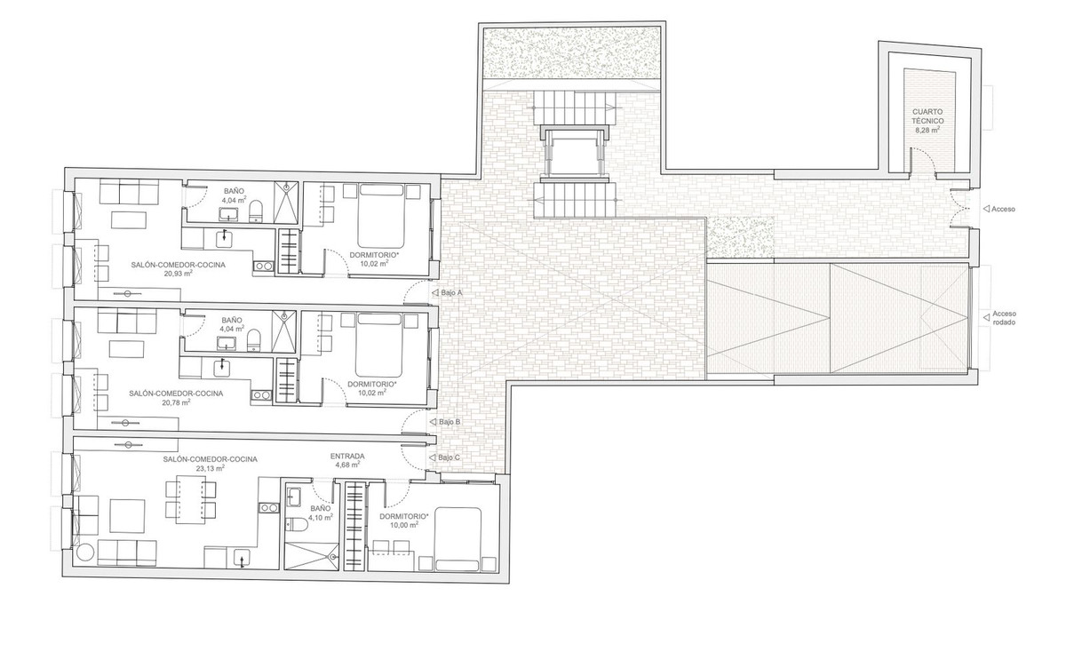 Vienas trijų kambarių dviaukštis butas.