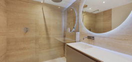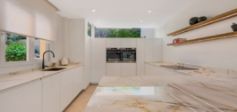Trijų lygių ir 212 m² ploto būste yra šviesi atviro plano svetainė su pagal užsakymą suprojektuota virtuve, aukščiausios kokybės prietaisais, vyno šaldytuvu ir židiniu. Didelės stumdomos durys veda į privačią terasą su sodu, idealiai tinkančią pramogoms.